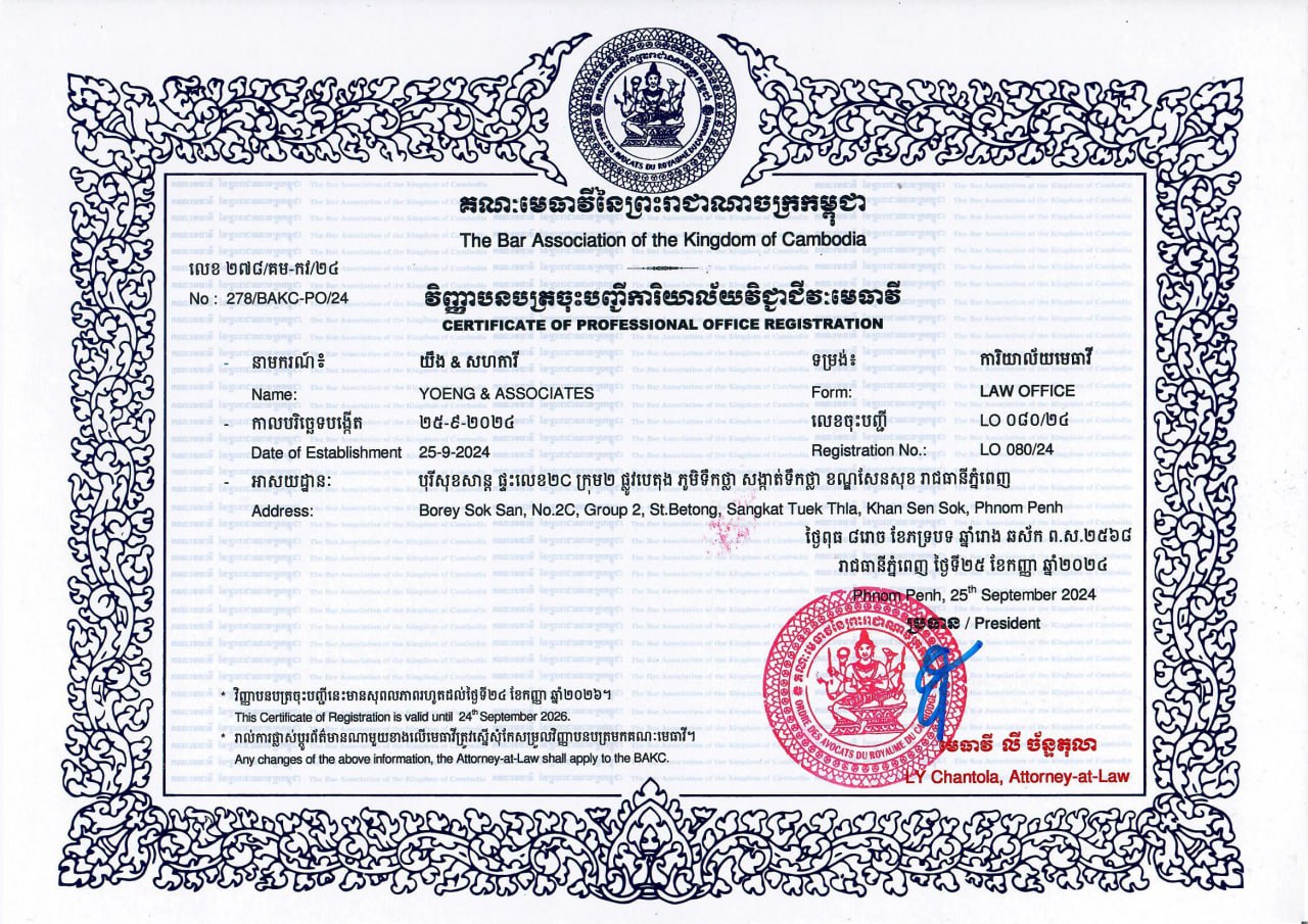 YOENG & ASSOCIATES shall be executed under lawyer's license No. 278/BAKC-PO/24 dated 25th September, 2024 issued by the Bar Association of the Kingdom of Cambodia. YOENG & ASSOCIATES provides legal services such below: